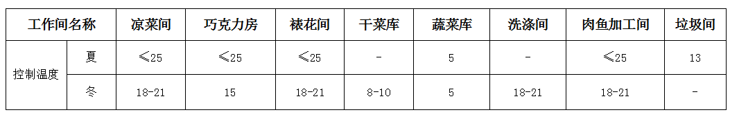 在規(guī)范中對工作專間有明確的定義:“指處理或短時間存放直接入口食品的專用操作間包括涼菜間、裱花間、備餐專間等。”我們這里的專間包含了其他專用工作間。各種專間溫度控制參照規(guī)范的要求和一般做法。設(shè)計人員要結(jié)合實際提出設(shè)計要求,例如.大型食堂和快餐店,在就餐準備之前有大量的食材要加,特別是魚、肉、禽、在室溫下擱置較長時間,不能隨時進行冷藏保鮮,夏季對室內(nèi)的溫度就要嚴格控制,或增加保鮮設(shè)備的容積、便于及時冷藏,防止經(jīng)過浸泡、擇洗、改刀的食材變質(zhì)。嚴格控制各區(qū)溫度和濕度是控制微生物生長、保證食品安全的關(guān)鍵。不同區(qū)域環(huán)境有不同的溫度和濕度要求。主食庫、調(diào)料庫、干品庫只要控制濕度,各加工區(qū)需要控制溫度,見下表