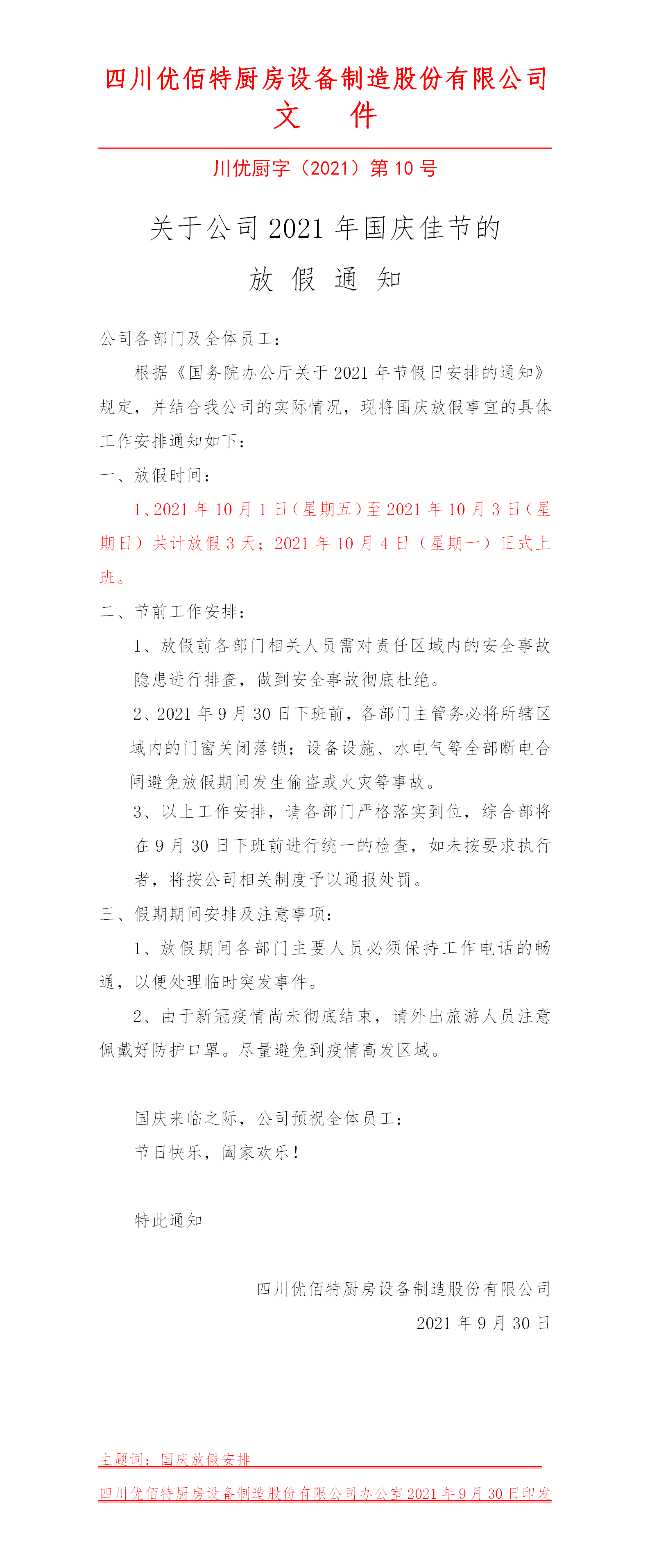 根據國務院2021年節假日放假安排,并結合我公司實際情況,現對國慶放假做出如下安排: