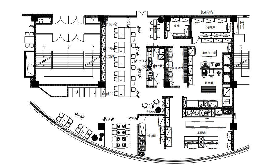 使用的灶具少,灶具主要是用大鍋灶煮面、熬粥,只需一兩眼炒灶用來制作主食配料,或用來煮零點(diǎn)的面條、餃子;使用的機(jī)械設(shè)備多,如和面機(jī)、壓面機(jī)、包子機(jī)、菜焰機(jī)、攪拌機(jī)等;蒸、煮、烤、炸、煎設(shè)備用得多,蒸飯柜、夾層鍋、烤箱、電炸 鍋、電餅鐺等;主食加工間與副食加工間特點(diǎn)不同,主食的米飯、饅頭、包子、餃子等食品大多是批量制作,批量蒸煮生產(chǎn)。所以,除煎炸食品外,生制與熟制可以分開區(qū)域設(shè)置。熟制區(qū)需要出餐臺(tái),生制區(qū)需要機(jī)械設(shè)備、工作臺(tái)、及原料運(yùn)送,傳餐通道要有一定的寬度,通道要設(shè)置合理。由于經(jīng)營方式、餐品類別、加工工藝、出餐產(chǎn)量大小差異較大,主食加工間布局與飯店廚房設(shè)計(jì)自有特點(diǎn)。