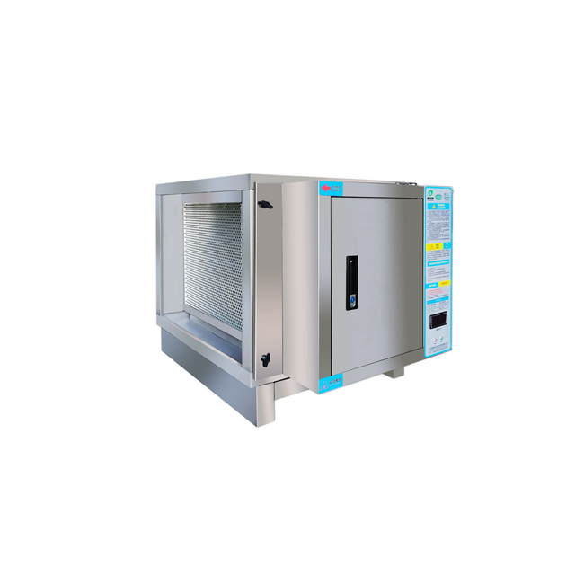 低空油煙凈化器為雙區式靜電吸附型,用來去除細微粒徑油煙分子和其它空氣中的雜粒。雙區式是指內部電場的高壓電離區與低壓吸附區,氣體中的油煙微粒在經過電場的高壓電離區時,油煙分子會被電離并帶有正或負電荷;之后經過低壓區時,將會因電場力的效果而吸附在極板上,流向集油槽。