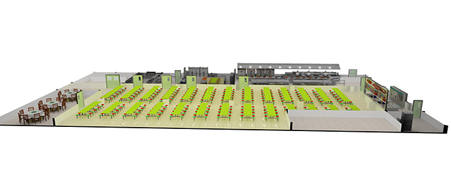 1.方便收殘和餐具傳送:餐具重量大、數量多、易破損,減少搬運有利于減少破損損耗,減輕傳送餐具的勞動強度。為方便收殘和餐具傳送,洗碗消毒間要設在收殘口,以便用餐車推送餐具,并力求在同一平面內,無臺階、錯層。條件不允許的廚房,也要在出餐口附近設消洗間。不宜進入廚房深處,減少運送距離,也減少殘食與新餐品的交叉。